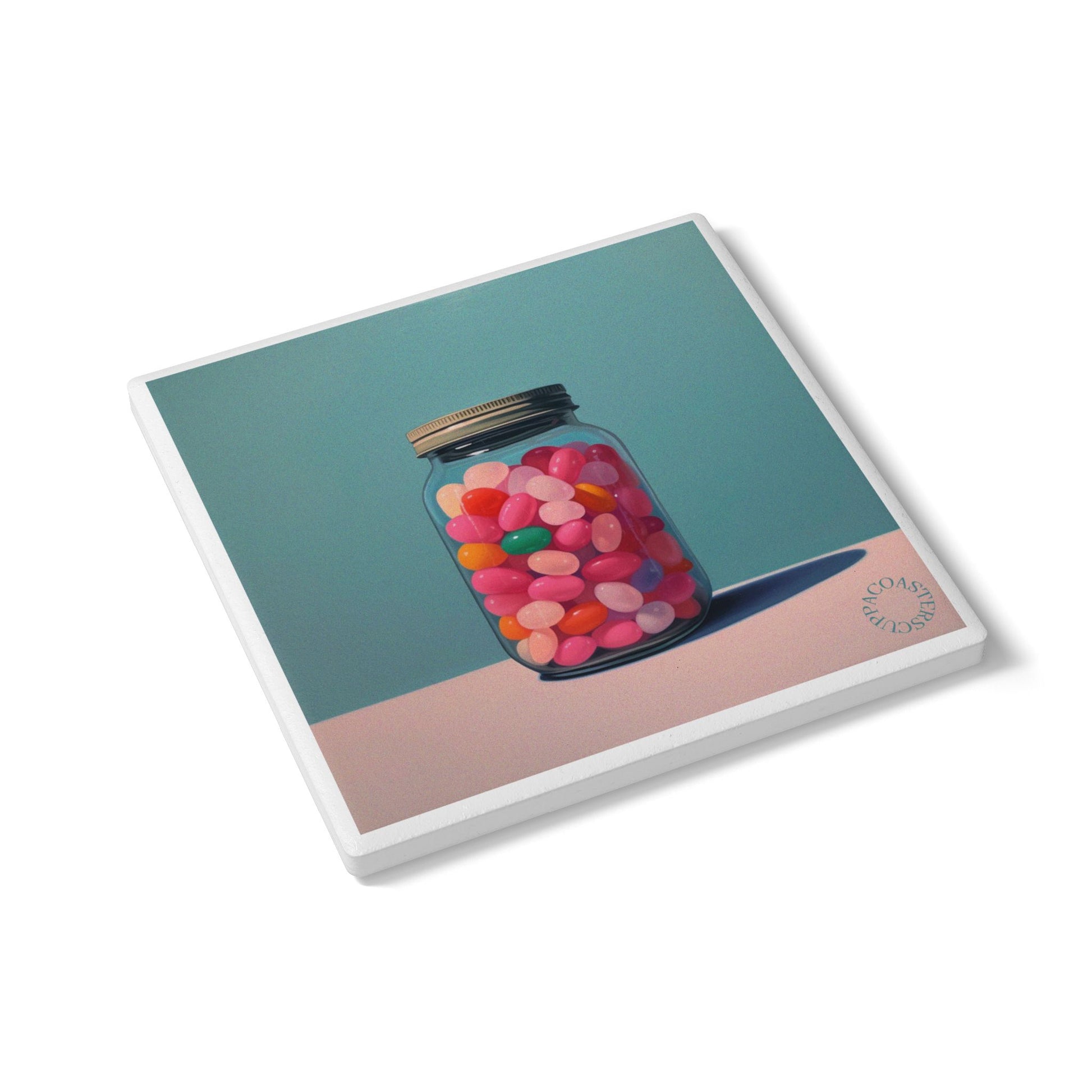Bright, nostalgic, and irresistibly cheerful — the Sweet Spot Ceramic Coaster brings a playful pop of colour to your table. Featuring a glass jar packed with candy-coloured jelly beans, it’s a perfect blend of retro charm and modern minimalism. This design instantly lightens the mood, making it ideal for vibrant kitchens, fun workspaces, or anywhere that deserves a little sweetness.