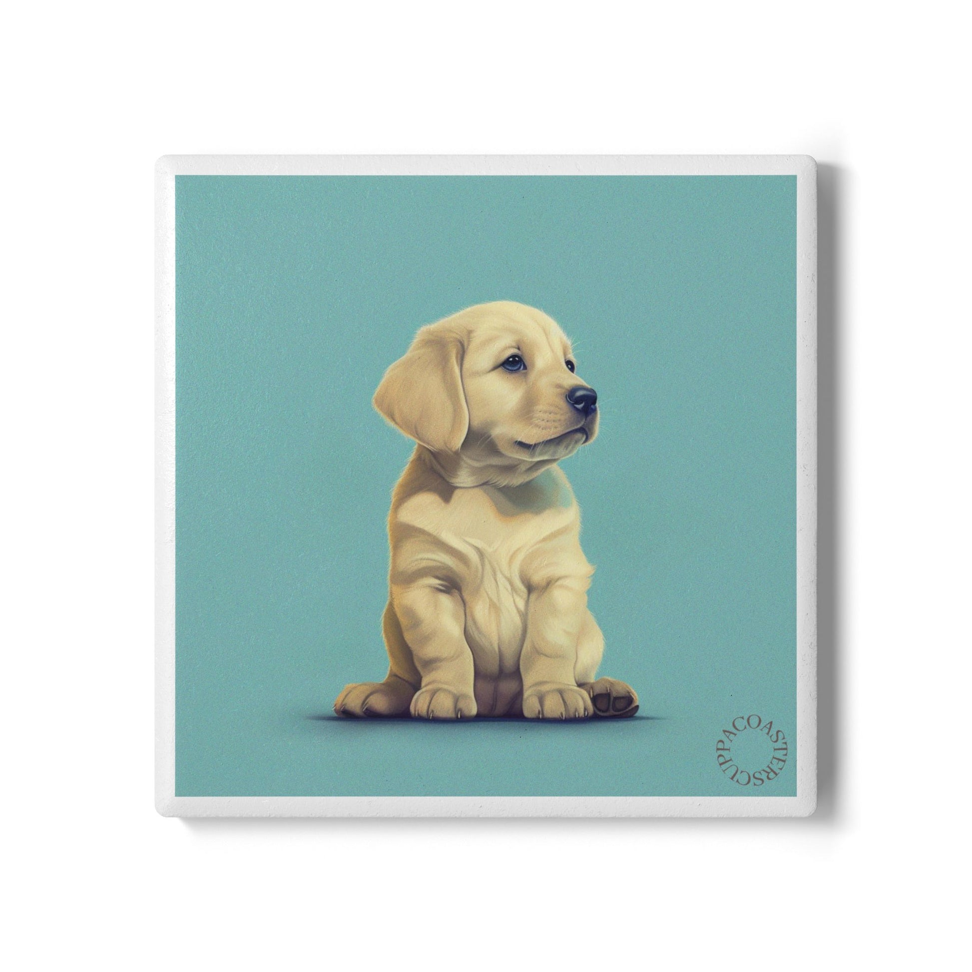 Bring charm and comfort to your space with the Golden Pup ceramic coaster. Featuring a lifelike golden retriever puppy against a calming teal background, this design captures innocence, loyalty, and heartwarming simplicity.