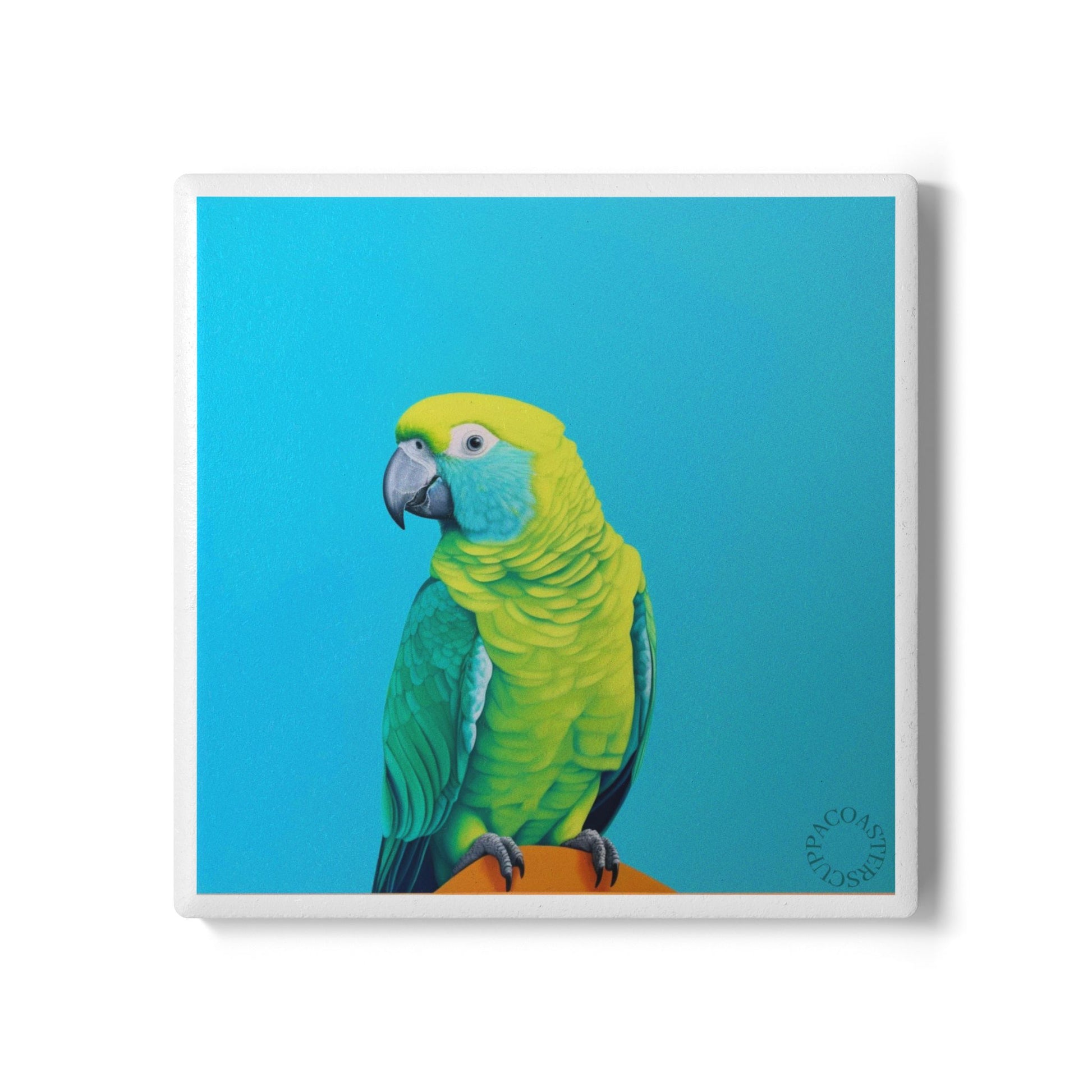 Bursting with colour and charisma, the Tropical Parrot ceramic coaster captures paradise in perfect balance. Its vibrant green and yellow plumage pops against a rich turquoise background — a bold fusion of tropical energy and contemporary design.